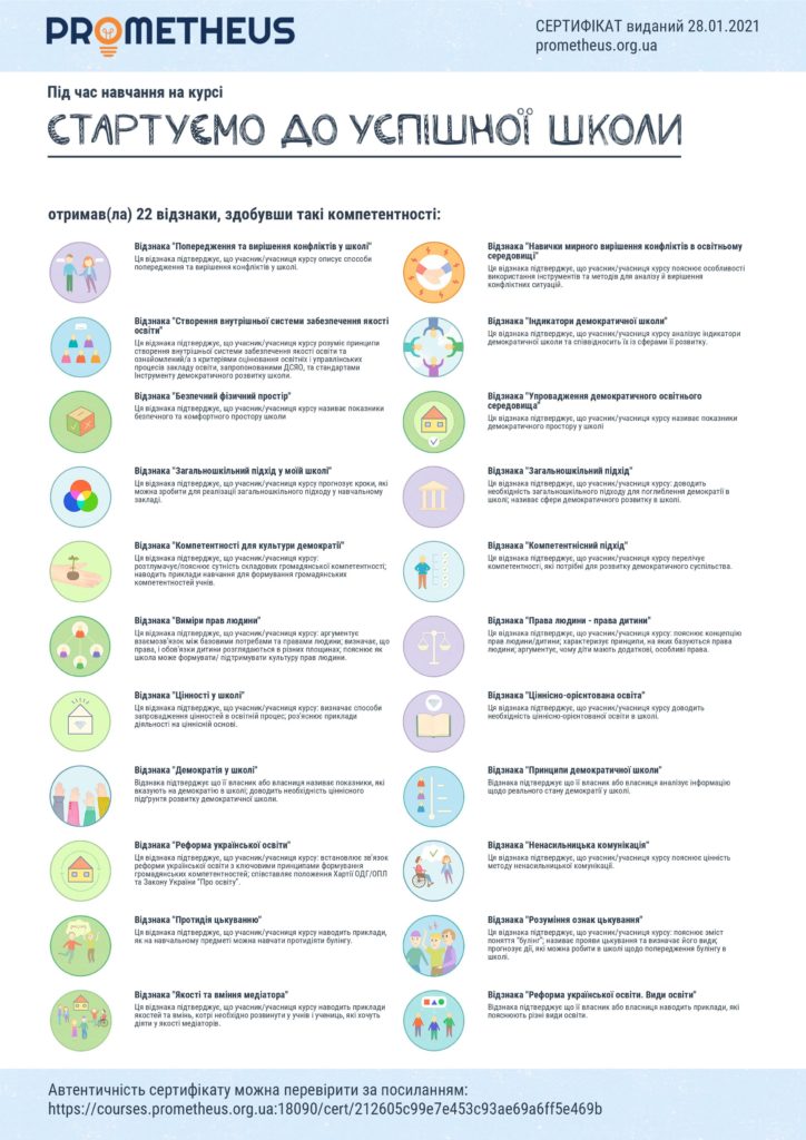 “Starting towards a successful school” is the first intro course which will be followed by three more MOOCs: “Secrets of the successful principal”, “Everyday solutions for teaching” and “School and community for students”. All 4 MOOCs constitute a series of courses for teachers and principals “30 steps towards the New Ukrainian School: Educating a Citizen” developed by the Schools for Democracy team together with Prometheus.