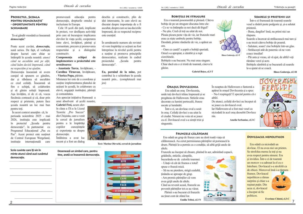 Gabriel’s visit left an impression. In its November issue, the Pas cu Pas school newspaper Over the Rainbow invited readers to reflect on what democracy truly means, featuring drawings created by students illustrating their own interpretations of democracy.